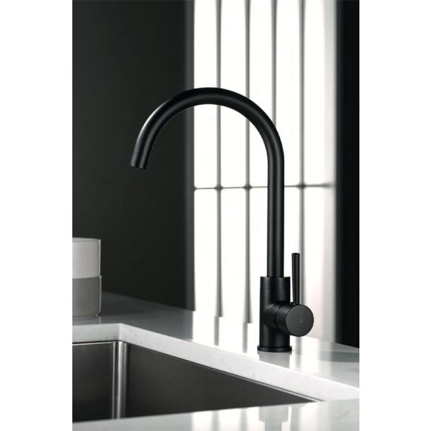 Grifo monomando curvo de cocina IMEX en Murcia, disponible en cromo y negro mate. Fabricado en latón cromado con cartucho cerámico, ideal para tu cocina.
